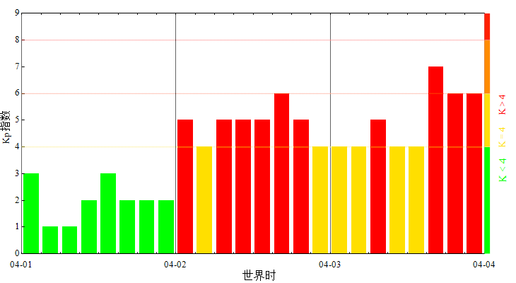 北京时间2026年4月3日23:00-4月4日02:00,地磁发生强烈扰动,达到大地磁暴水平(Kp=7),为橙色警报级别。此次地磁扰动过程从4月3日23:00开始,截至目前,共有3小时达到大地磁暴水平、6小时达到中等磁暴水平。本次磁暴事件是由1日的日冕物质抛射(CME)到达地球引起的。