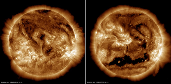 图2 SDO卫星观测到的9月25日的冕洞和10月2日目前日面上的冕洞(世界时)