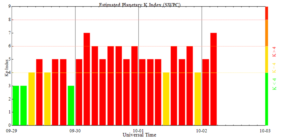 北京时间2025年9月30日11:00—14:00,地磁发生强烈扰动,达到大地磁暴水平(Kp=7),为橙色警报级别。此次地磁扰动过程从29日14:00开始,共有3小时达到大地磁暴水平,12小时达到小地磁暴水平,6小时达到活跃水平,主要是由冕洞高速流到达地球和地磁春秋分效应引起的。