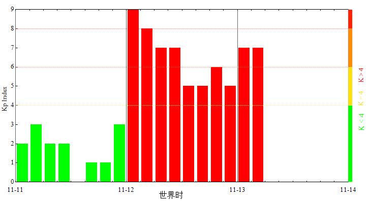 受9日和10日日冕物质抛射到达地球的影响,12日08:00-14:00地磁发生强烈扰动,Kp指数最大为9,达到红色警报级别。