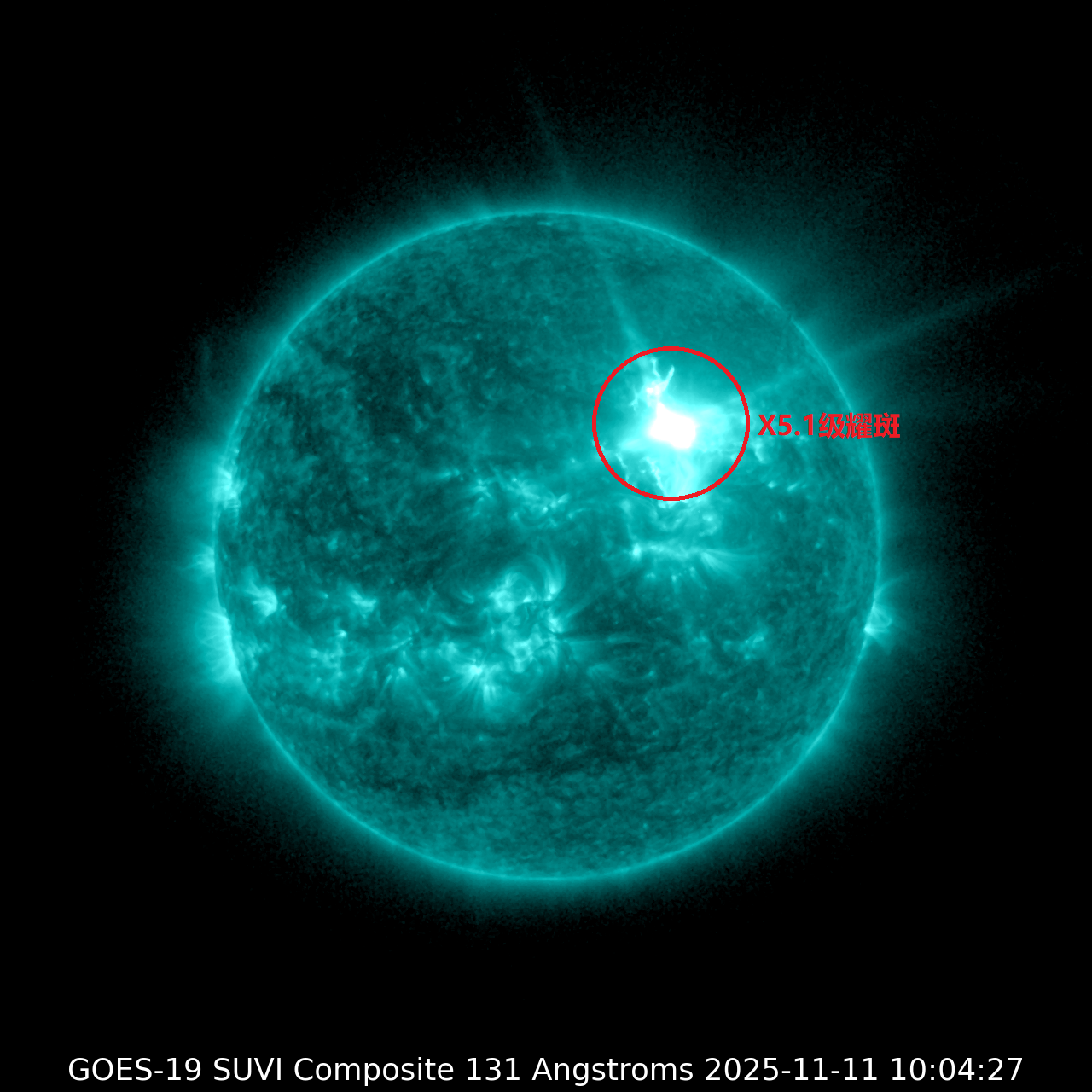 图3 2025年11月11日GOES卫星监测的X5.1级耀斑爆发(世界时)