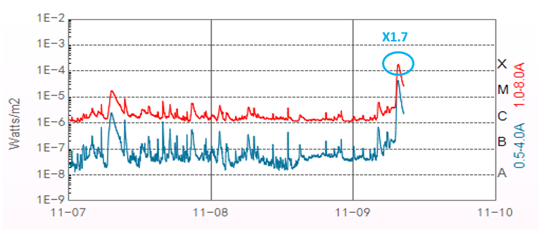 图3 2025年11月9日GOES卫星监测的X1.7级耀斑爆发(世界时)