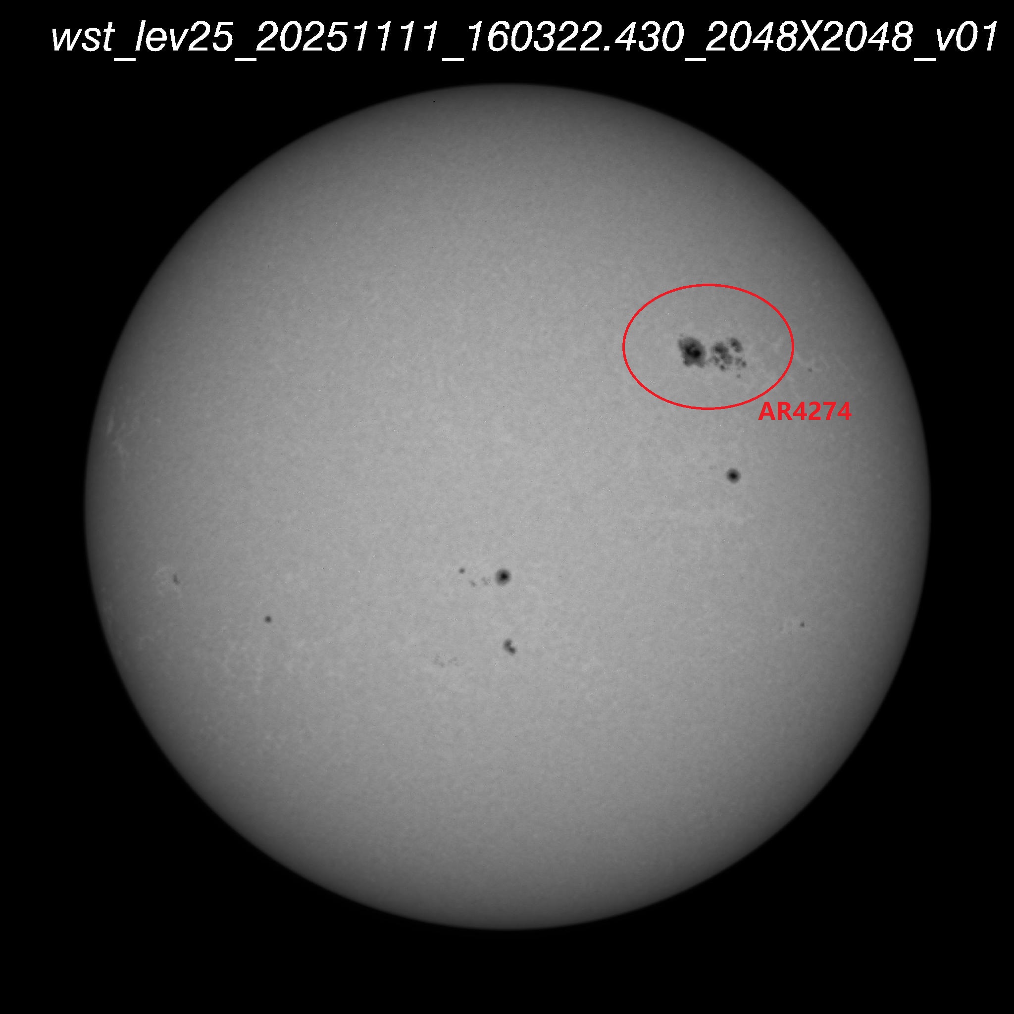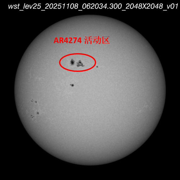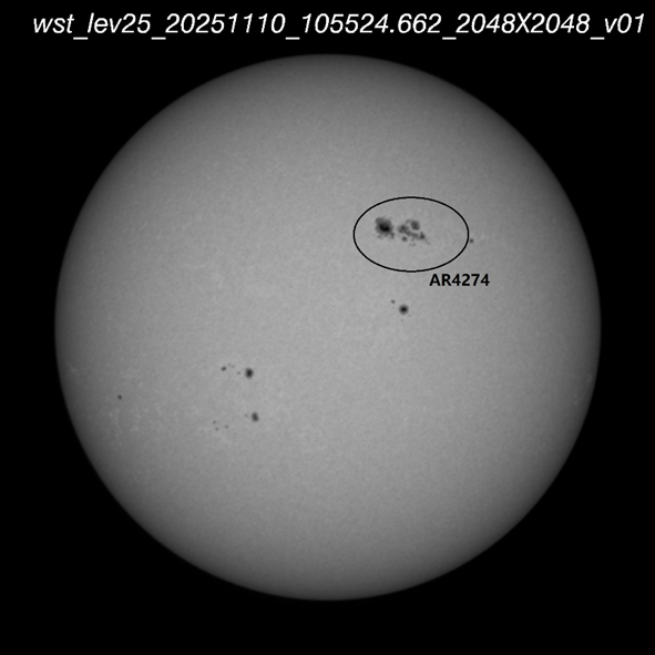 北京时间2025年11月10日17:01,活动区AR4274(N24W24)爆发了一个X1.2级耀斑,于18:19结束,达到橙色警报级别。