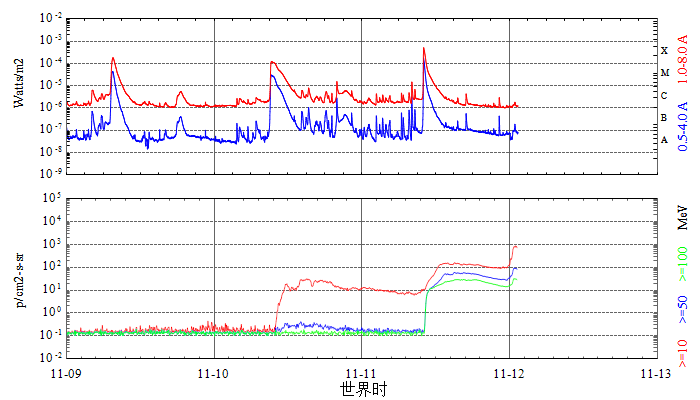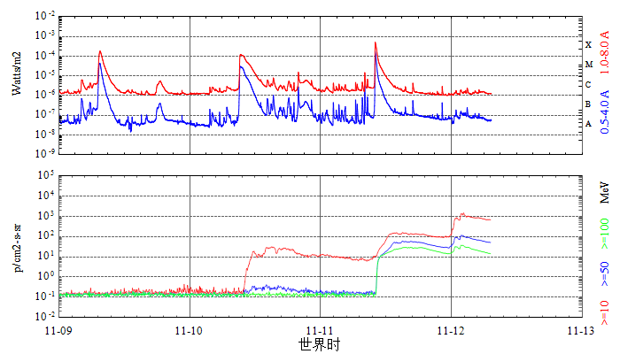 图1 2025年11月9-12日GOES卫星监测的X射线流量和质子通量