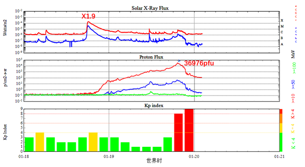 图1 2026年1月18-20日GOES卫星监测的X射线流量、质子通量和SWPC的地磁Kp指数(世界时)
