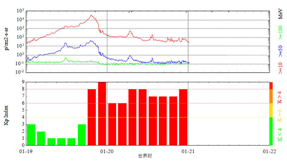 图1 2026年1月19-20日GOES卫星监测的质子通量和SWPC的地磁Kp指数(世界时)
