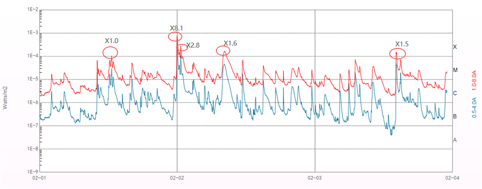 图1 2026年2月1-3日GOES卫星监测的X射线流量(世界时)